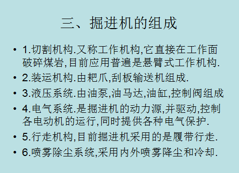 •1.切割機構(gòu).又稱工作機構(gòu),它直接在工作面破碎煤巖,目前應(yīng)用普遍是懸臂式工作機構(gòu).